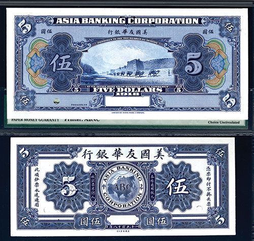 No Place Name, $5, P-S112p (S/M#Y35-2), Face and back uniface proofs printed on india paper in blue on m/c with camel caravan passing fort in middle, back blue with bank logo, Face is PMG graded Gem Uncirculated 66 EPQ (Exceptional Paper Quality) and back is graded Choice Uncirculated 64 NET with notation of punch hole filled, rare note and only example graded by PMG. ABNC.