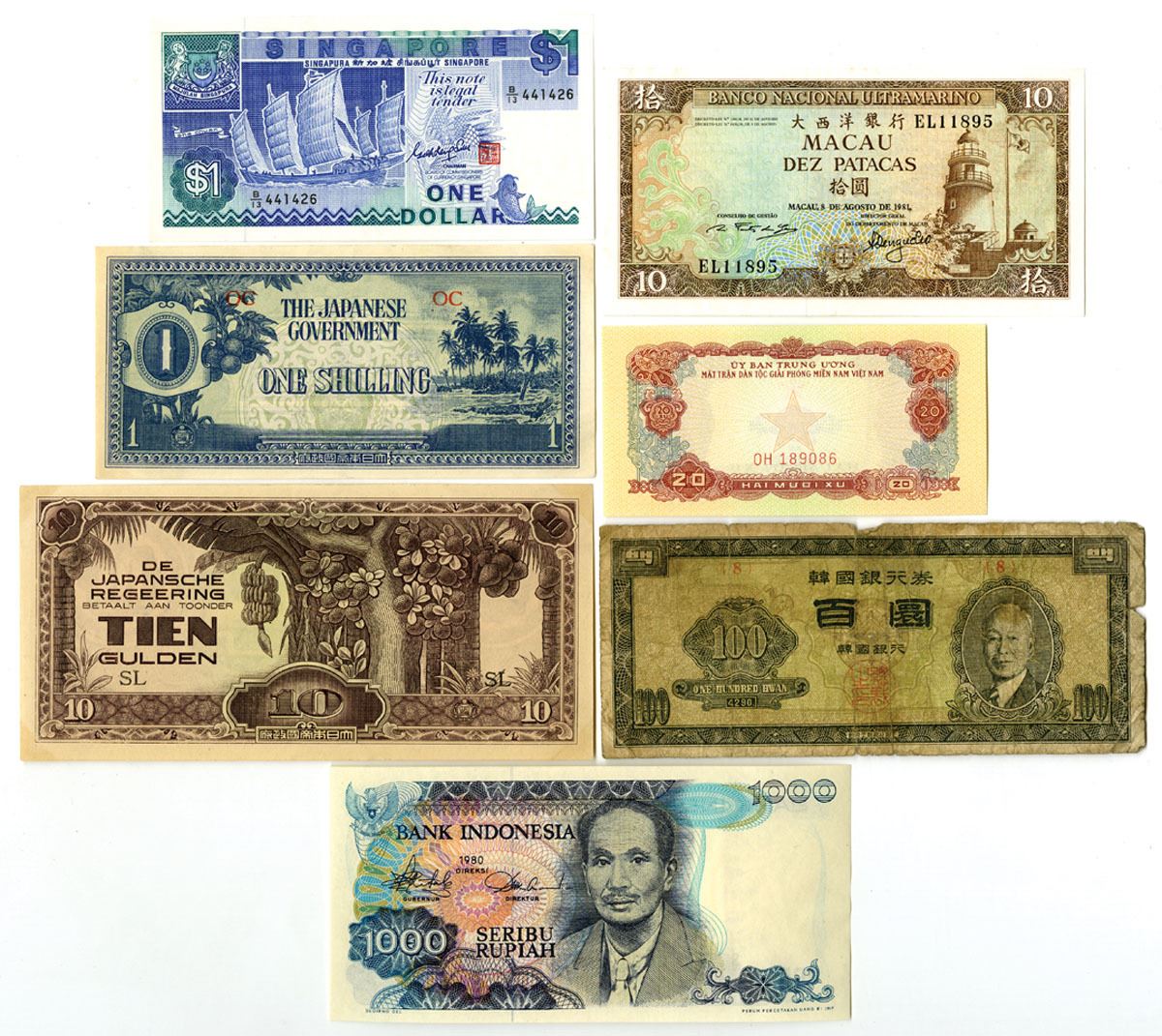 Asia, ND (1942) to 1980. Lot of 7 Issued Banknotes, Includes: Bank Indonesia, 1980, 1000 Rupiah, P-119; Japanese Occupied Oceania, ND (1942), 1 Shilling, P-2a; Japanese Occupied Netherlands Indies, ND (1942), 10 Gulden, P-125c; Banco Nacional Ultramarino Macau, 1981, 10 Patacas, P-59b; Board of Commissioners of Currency, ND (1987), 1 Dollar, P-18a, TDLR; Bank of Korea, 4290 (1957), 100 Hwan, P-21; Central Committee of the National Front of the Liberation of South Vietnam, ND (1968), 20 Xu, P-R2. Notes range from Good to UNC condition. (7). Sold "AS IS" no returns accepted.