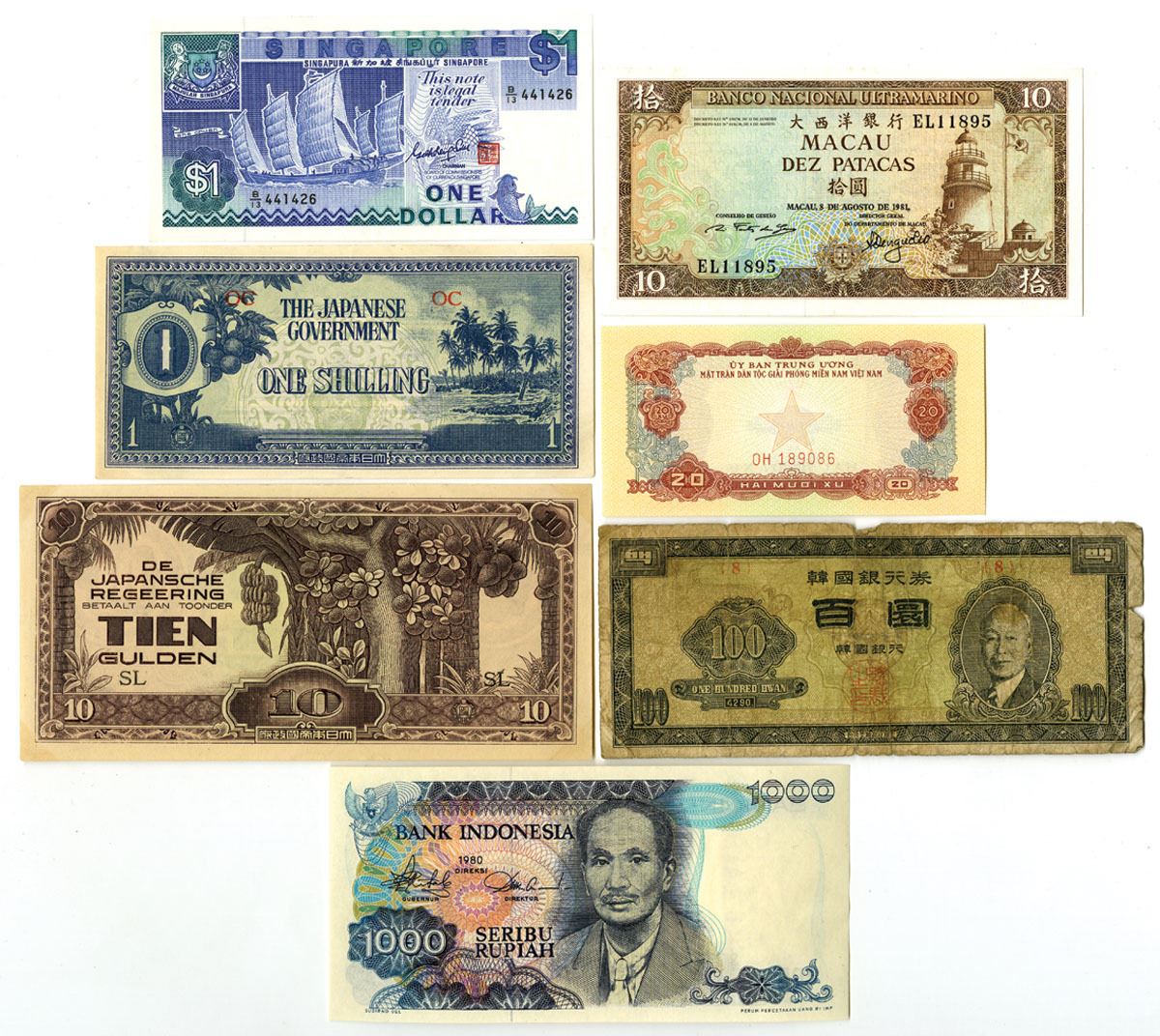 Asia, ND (1942) to 1980. Lot of 7 Issued Banknotes, Includes: Bank Indonesia, 1980, 1000 Rupiah, P-119; Japanese Occupied Oceania, ND (1942), 1 Shilling, P-2a; Japanese Occupied Netherlands Indies, ND (1942), 10 Gulden, P-125c; Banco Nacional Ultramarino Macau, 1981, 10 Patacas, P-59b; Board of Commissioners of Currency, ND (1987), 1 Dollar, P-18a, TDLR; South Korea, Bank of Korea, 4290 (1957), 100 Hwan, P-21; Central Committee of the National Front of the Liberation of South Vietnam, ND (1968), 20 Xu, P-R2. Notes range from Good to UNC condition. (7). Sold "AS IS" no returns accepted.