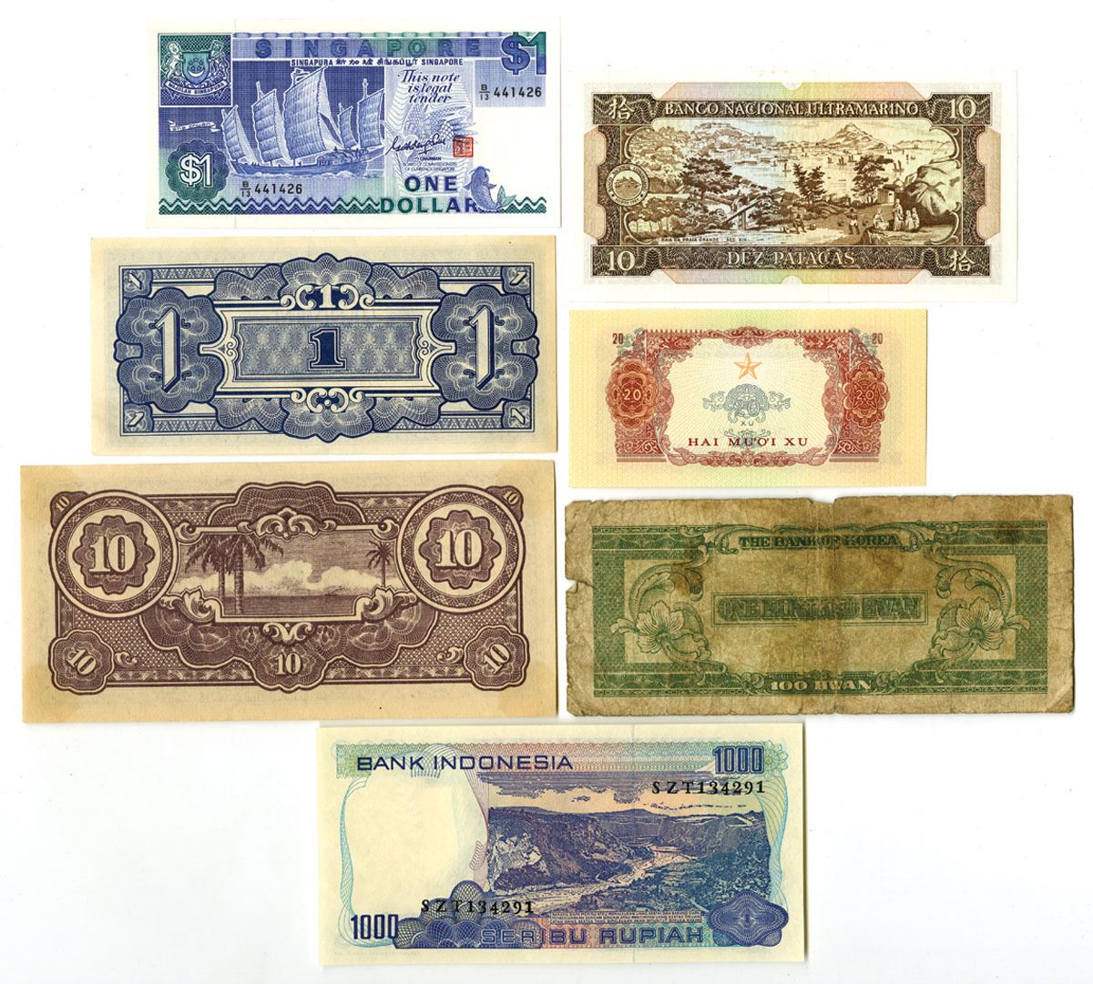 Asia, ND (1942) to 1980. Lot of 7 Issued Banknotes, Includes: Bank Indonesia, 1980, 1000 Rupiah, P-119; Japanese Occupied Oceania, ND (1942), 1 Shilling, P-2a; Japanese Occupied Netherlands Indies, ND (1942), 10 Gulden, P-125c; Banco Nacional Ultramarino Macau, 1981, 10 Patacas, P-59b; Board of Commissioners of Currency, ND (1987), 1 Dollar, P-18a, TDLR; South Korea, Bank of Korea, 4290 (1957), 100 Hwan, P-21; Central Committee of the National Front of the Liberation of South Vietnam, ND (1968), 20 Xu, P-R2. Notes range from Good to UNC condition. (7). Sold "AS IS" no returns accepted.