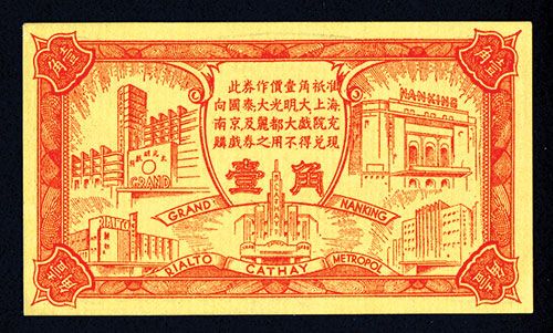 10 cents, Voucher good at Nanking & Rialto Theatres, Orange on face with theatre buildings on left and right, back gray green, Unc. To CU.