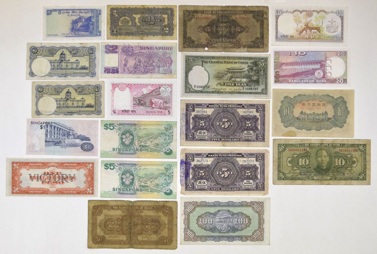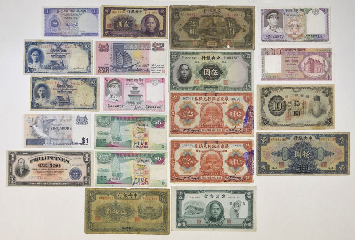 China, Singapore, Korea, Philippines, and other Far East Countries, 1918-92. Lot of 15 Issued Banknotes from China, Korea, Thailand, Nepal, Singapore, and the Philippines. Includes: Central Bank of China, 1928, 10 Dollars, P-197e, ABNC; 1936, 5 Yuan, P-217a, W& S; 1941, 2 Yuan, P-230, CHB; 1941, 50 Yuan, P-242b; Bank of Taiwan, 1946, 100 Yuan, P-1939 S/M#T72-5, CPF; Provincial Bank of Kwangtung Province, 1918, 5 Dollars, P-S2402b (2), ABNC; Bank of Communications-Shanghai, 1927, 5 Yuan, P-146B, S/M#C126-203, ABNC; Bank of Chosen, ND(1944). 10 Yen, P-36a; Central Bank of Nepal, ND (1974), 5 Rupees, P-23a & 10 Rupees, P-24a; Philippines Treasury Certificate, ND (1944). 1 Peso, P-94, USBEP; Singapore Board of Commissioners of Currency, ND (1976-92), 1 Dollar, P-9, ND (1976), BWC; 5 Dollars, P-19 (2), ND (1989), TDLR; 2 Dollars, P-28, ND (1992), TDLR; Government of Thailand, ND (1948), 1 Baht, P-69a (2), TDLR. Notes range from Fine to XF condition. (20). Sold "AS IS" no returns accepted.