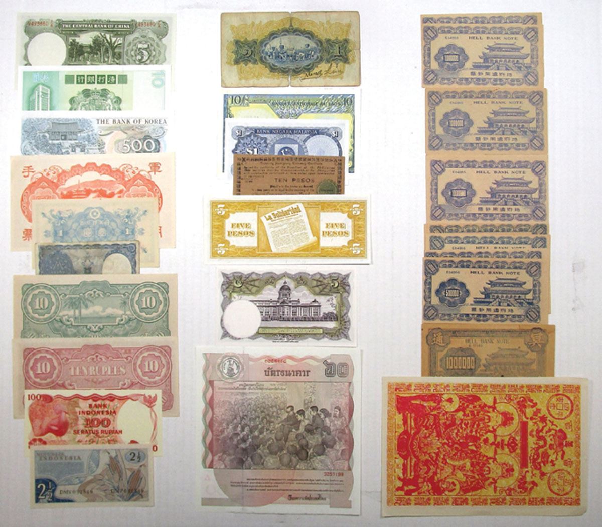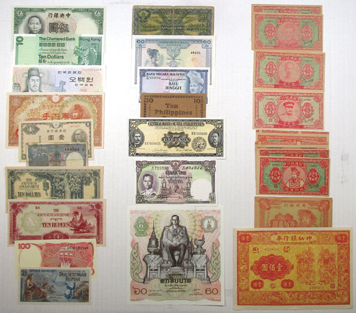 Asia, 1930-70s. Lot of 25+ Issued Banknotes from Various Asian Countries, Including: Japan, Hong Kong, Malaya, Burma, China, Indonesia, Laos, Thailand and more. Notes range from VF to CU condition. (27). Sold "AS IS" no returns accepted.