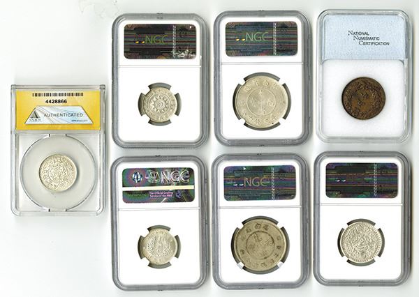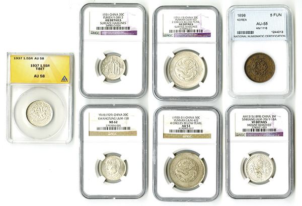 China, Korea and Tibet Lot of seven (7) coins, comprising, Fukien, 20 cents, Y-389.3, NGC graded AU Details; Kwangtung, 20 cents, L&M-158, NGC graded MS-62; Sinkiang, 3 Mace, Y-18A, NGC graded VF Details; Yunnan, 50 cents, L&M-422 two circles, NGC graded AU Details and Yunnan, 50 cents, L&M-422 four circles, NGC graded AU-53; Korea, 5 Fun KM #1116, NNC graded AU-55; and Tibet 1937 1.55R, ANACS graded au 58, each is graded and encapsulated by various companies, attractive assortment.