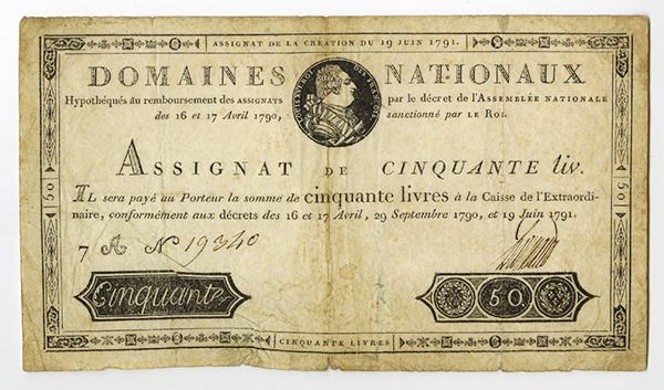 France, 50 Livres, P-A43, Choice Fine to VF, large margins with no edge faults, just some light toning, King Louis XVI at top.