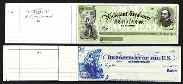 United States. Check forms. Ca. 1860s. Stanton vignette on first. Both printed by Hatch & Co. NY. Long forms with counterfoil as removed from a larger book. Uncirculated. 2 pieces.