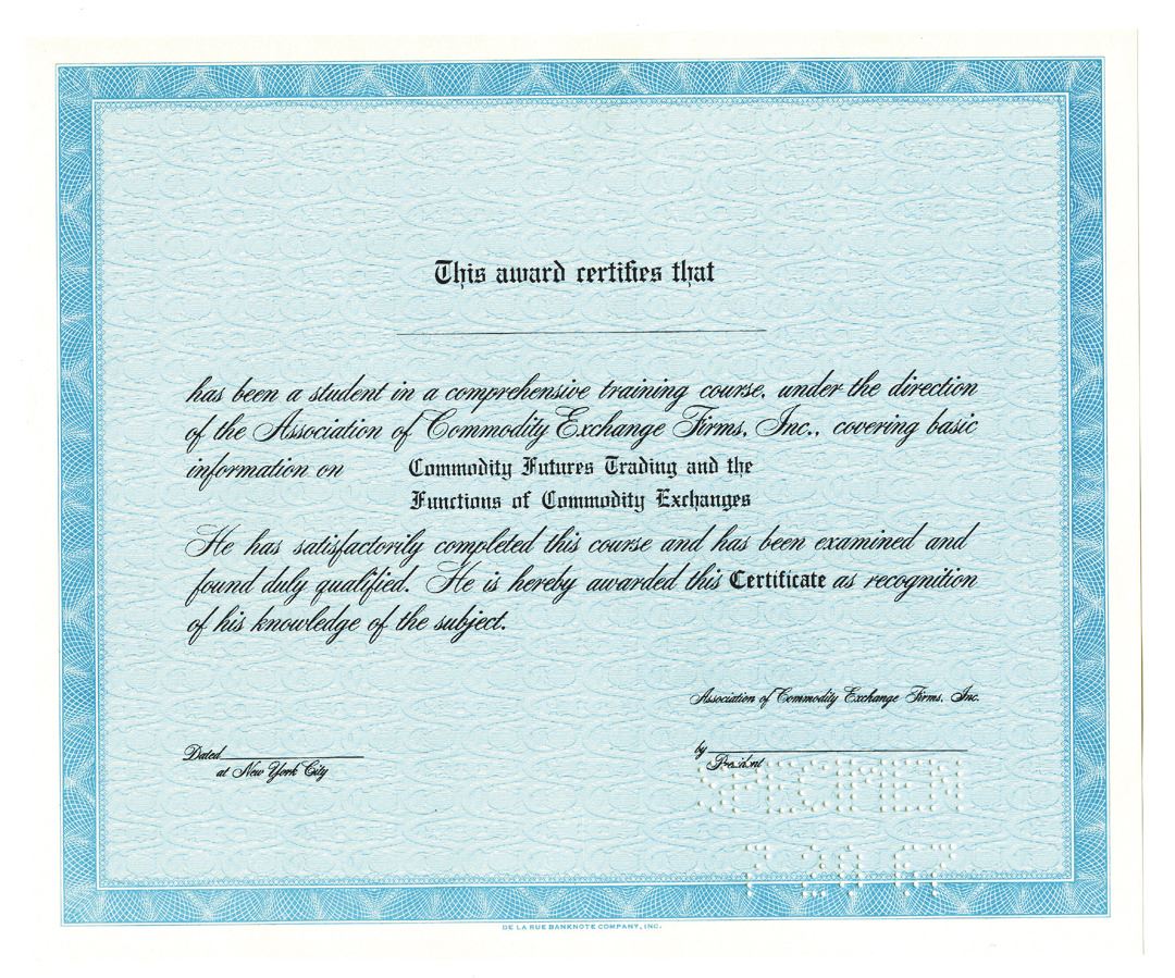 New York, 1967. Specimen Certificate for the course completion of commodity futures trading and the functions of commodity exchanges, Black text with aqua border and background. POCs, VF condition.