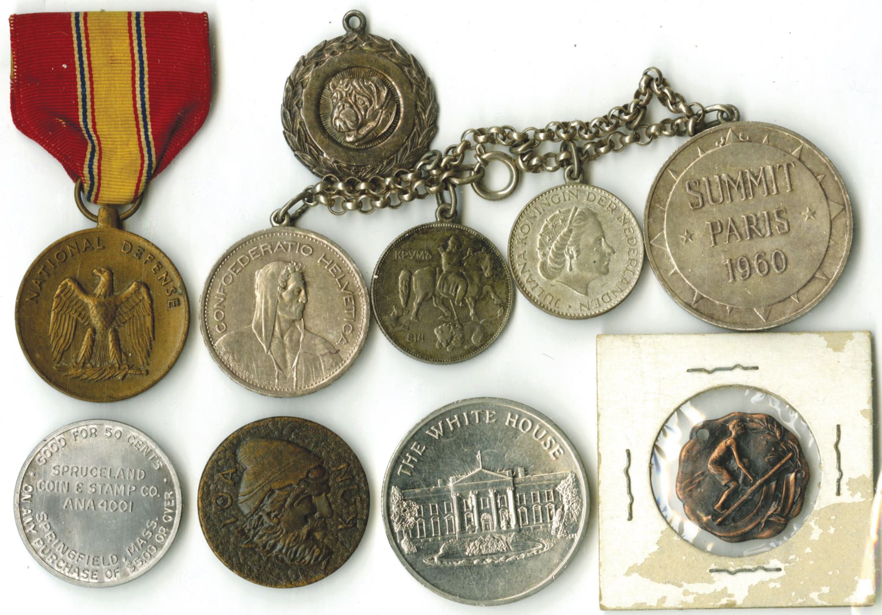 Token.... medal and coin issues. Lot of 7 items: 1917 Runners medal in bronze with "S.L.A. 8-25-17" engraved on reverse; 1964, 50 Cents token with Confederate States of America 1961 commemorative half dollar reverse on back, issued by the Spruceland Coin & Stamp Co.; Seal of the President of the United States and White House commemorative coin; Coin of Ancient Ithaca, 1932 to commemorate the opening of the new building of the First National Bank of Ithaca, N.Y., Obv: Odysseus portrait, Rev: Text & Date; National Defense Medal with ribbon, Eagle on obverse, reverse with shield and laurel; A vintage dog medal, may be for a dog's collar, Bulldog or Pug on front with laurel surrounding; and a single bracelet with 4 coins attached: commemorative Paris Summit 1960 coin with Dwight D. Eisenhower engraved signature and 3 additional coins, a 5 Swiss Franc 1954 coin, a Netherlands, 1958 1 Gulden coin, and Bulgaria, 1930 5 Leva coin. 7 pieces total. (SOLD AS IS, NO RETURN ACCEPTED)