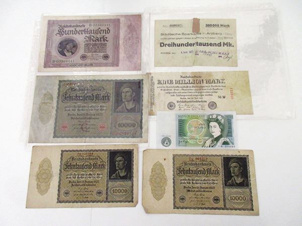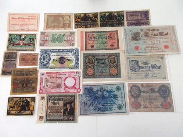 Group of assorted European & Other issues, includes notes from Austria (2); Bulgaria (3); Finland (1); Germany including inflation and notgeld issues (21); Great Britain (1); Greece (2); Hungary (2); Poland (1); Russia (3); Spain (3); and Yugoslavia (1). Also included Central Bank of Nigeria 1 Pound 1967. Generally average circulated. Please inspect, sold as is.
