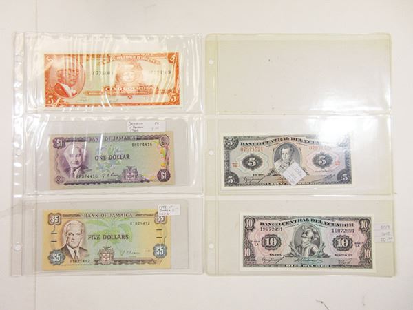 Group of assorted Central & South American issues, includes notes from Argentina (2); Belize (1); Costa Rica (2); East Caribbean Territories (1); Ecuador (5); Guatemala (1); Guyana (2); Haiti (1); Jamaica (2); Mexico (11); and Uruguay (1). Highlights include Mexico P-S1114a VF; Haiti P-202 UNC; Ecuador P-109 UNC. Please inspect, sold as is.