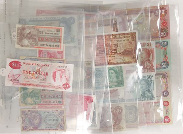 Group of assorted Worldwide issues, includes notes from Barbados (1); Bermuda (1); Ceylon (3); East Caribbean Territories (1); England (3); Fiji (3); French Indo-China (1); Gibraltar (1); Guyana (1); Hong Kong (3); Jamaica (4); Netherlands (3); New Caledonia (4); Papua New Guinea (1); Suriname (2); Tahiti (1); Trinidad & Tobago (1); and US Military Payment Certificates (4). Generally average circulated, with a few choice uncirculated pieces. Please inspect, sold as is. (38 notes)