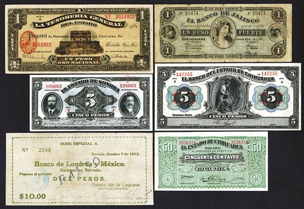 Mexico. Highlights include Coahuila, Banco de Londres y Mexico / Banco de la Laguna, 10 Pesos, P-592b (FALSO overprint), Choice Fine to VF, S/N 2243; Jalisco P-S313a; Chihuahua, P-528c; P-S132a; Sonora, P-S1072; P-Yucatan, P-1135. Generally Very Good, two Uncirculated. 6 pieces.