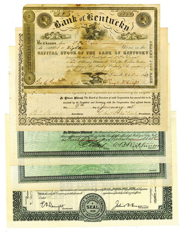 Kentucky, Missouri, Indiana, & Michigan. 5 Pieces. Group of banking related issued stock certificates, Including Bank of Kentucky 1843, Citizens Bank of Michigan City 1888 and Detroit Bankers Co. 1930. All ranging from Fine-VF condition.
