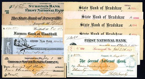 1850's-1900's, Assortment of Issued Checks Lot of 12, All but one have orange 2 cent imprinted revenue stamp, Fine-VF condition lot.