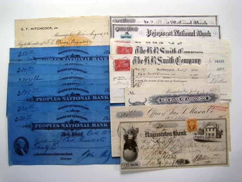 1860's-1900's, Checks from Pejepscot National Bank (2), Peoples National Bank Rock Island (8), Hagerstown Bank (1) by ABNC, Some have attached revenue stamps, Mixed condition lot from Fine - VG condition.