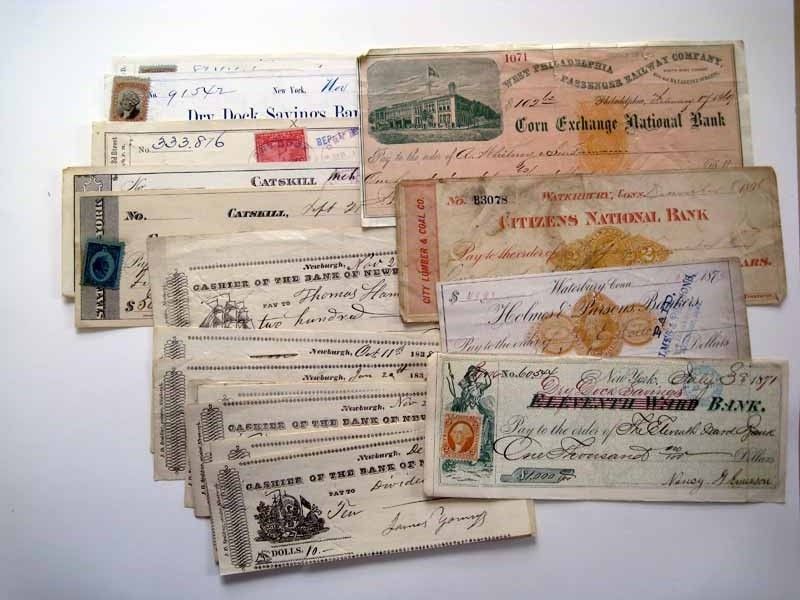 1830's-1880's, Checks from Bank of Newburgh (11), New York Dry Dock Savings Bank (2), Catskill National Bank (2) and 5 others, Mixed condition lot ranging Fine - VG condition.
