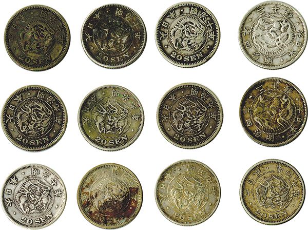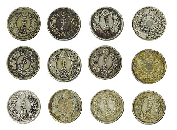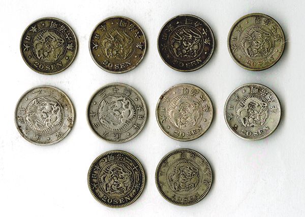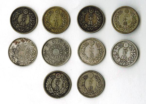 Yr.3(1870) VF; Yr.4(1871)(3) Fine-VF; Yr.6(1873)(4) Fine, VF, VF, EF; Yr.7(1874)(3) VF, VF, EF; Yr.9(1876)(6) Fine stains, VF, VF, VF, EF, EF; Yr.10(1877)(3) Fine; one is dark; Yr.18(1885) F-VF; Yr.21(1888) F-VF. Most with silvery gray toning. [22]