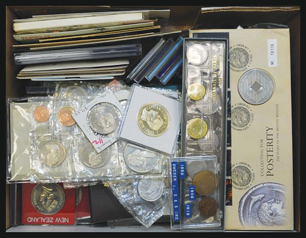 Assortment of Modern Non-Silver Sets and Singles from Around the World Modern New Zealand mint sets(10); Assorted single crown-size coins mostly from Guernsey, Western Samoa, Tokelau, St. Helena, Marshall Islands and New Zealand. Other surprises. Should be seen. Sold as is. [Total of 120+ sets and singles], weight approximately 13 lbs.
