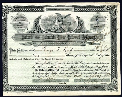 Oregon, 1912, I/U Stock, 1 Share, #49, Black print with ornate black border and vignette of allegorical woman top center with Eagle, VF condition, Glass & Proudhomme, Printers and Lithos. Listed railroad but unlisted stock in Cox.
