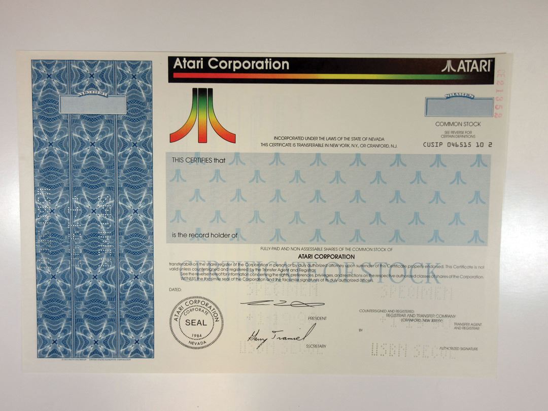 Nevada, 1990. Odd Shares Specimen Stock Certificate, Black text with blue border at left and underprint, Atari colorful logo at top and top left. Pin-punch specimen POCs. VF condition, SC-USBN. Atari Corporation was an American manufacturer of computers and video game consoles.