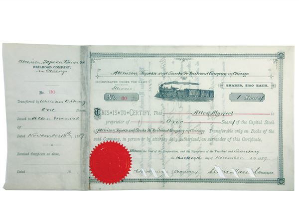 Kansas (Inc. in Chicago, IL), 1 Share, I/C, Black with no underprint, Locomotive R-L in center, S/N 30, Red seal. Issued to Allen Manvel and signed by Manvel as president, VF to XF condition. Another scarce Kansas railroad.