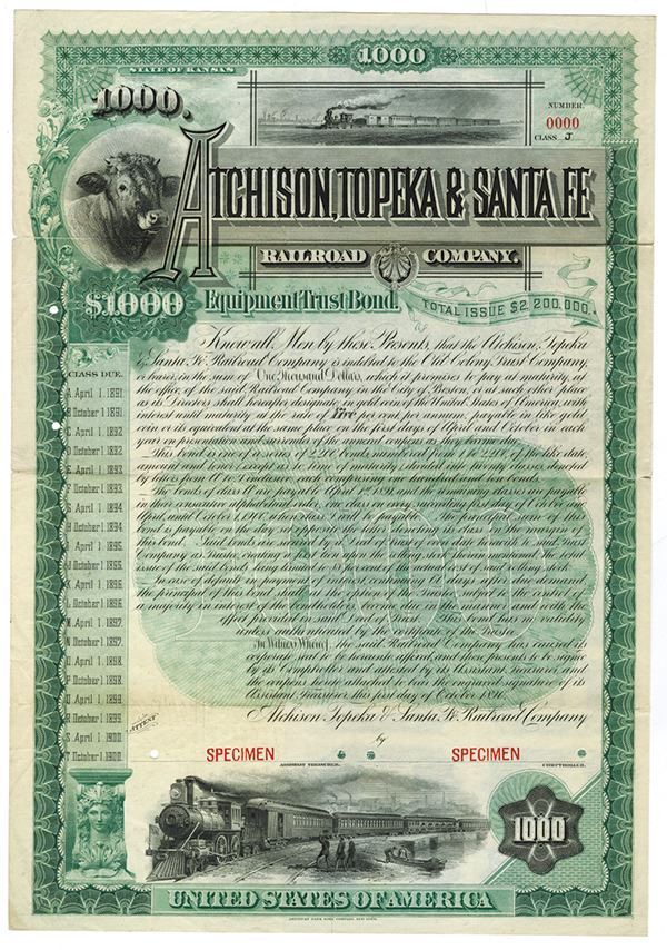 Kansas. $1,000 Specimen 5% Equipment Trust Gold Coupon Bond, Black print on green border and under tint, Locomotive at top above title and below at bottom, cow at right, Specimen overprints and POC's, VF-XF condition, ABNC. Unlisted bond type, design and date in Cox and very possibly unique in the ABN Archives.