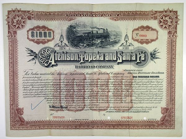 Kansas, 1889 Specimen $1000 General Mortgage 4% Gold Bond, Black printing with purple-brown border and undertint, Locomotive passing by a bay at top. Red specimen overprints, "0000" serial numbers and POC's, Fine condition with a blue checkmark on bottom left and slight toning along creases, ABNC NY. Rare as a specimen, only listed as Issued Cancelled in Cox.