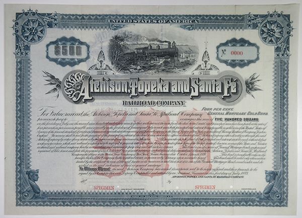 KS. 1889. $500 Specimen 4% General Mortgage Gold Bond, Black text with blue border and red underprint, Scene of train passing by at top. Red specimen overprints, 00000 serial number, and POCs. VF-XF condition, HLBN. Only known as a specimen in Cox.