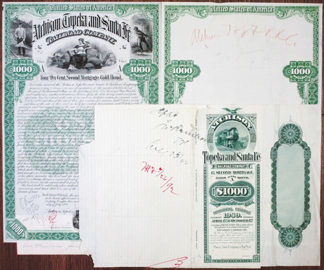 Kansas. Lot includes 3 proofs, all related to the production of bonds for the Atchison, Topeka and Santa Fe Railroad Company. Commerce seated amid sacks, man with flag top left, brakeman top right, vertical format, class A 2nd mortgage, bearer gold coupon, 4%, 97-yr, 1892, due 1989, One is a completed $1000 4% Second Mortgage Gold Bond in green, with approval initials at bottom left corner and note "Mr. Freeland Face"; Border and undertint background for bond in green, with approval initial at bottom and some notes made near top; Also includes back of bond with approval initial along with date, glued to a cardstock background. Unique lot. Fine to VF condition. All printed on india paper either mounted or unmounted on card. Unlisted as a proof in Cox, only as a specimen and I/C certificates. (3)