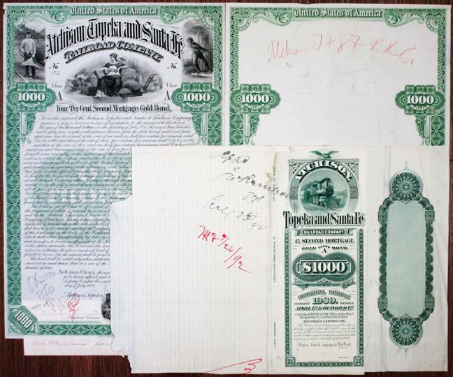 Kansas. Lot includes 3 proofs, all related to the production of bonds for the Atchison, Topeka and Santa Fe Railroad Company, Includes: Face of bond printed on india paper in black with green border and undertint, Commerce seated amid sacks, man with flag top left, brakeman top right, vertical format, class A 2nd mortgage, bearer gold coupon, 4%, 97-yr, 1892, due 1989, One is a completed $1000 4% Second Mortgage Gold Bond in green, with approval initials at bottom left corner and note "Mr. Freeland Face"; Border and undertint background for bond in green, with approval initial at bottom and some notes made near top; Also includes back of bond with approval initial along with date, glued to a cardstock background. Unique lot. VF condition. All printed on india paper either mounted or unmounted on card. Unlisted as a proof in Cox, only as a specimen and I/C certificates. (3)