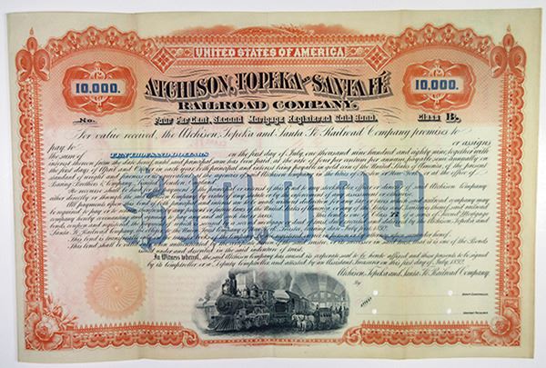 Kansas, 1892 Specimen $10,000 Registered Second Mortgage 4% Gold Bond, Black text and vignette with orange border and blue undertint, Locomotive in station next to a horse carriage at bottom. No specimen overprints and POC's, VF-XF condition, ABNC NY. Unlisted denomination and color in Cox. This was the only example found in the ABN Archives in 2002.