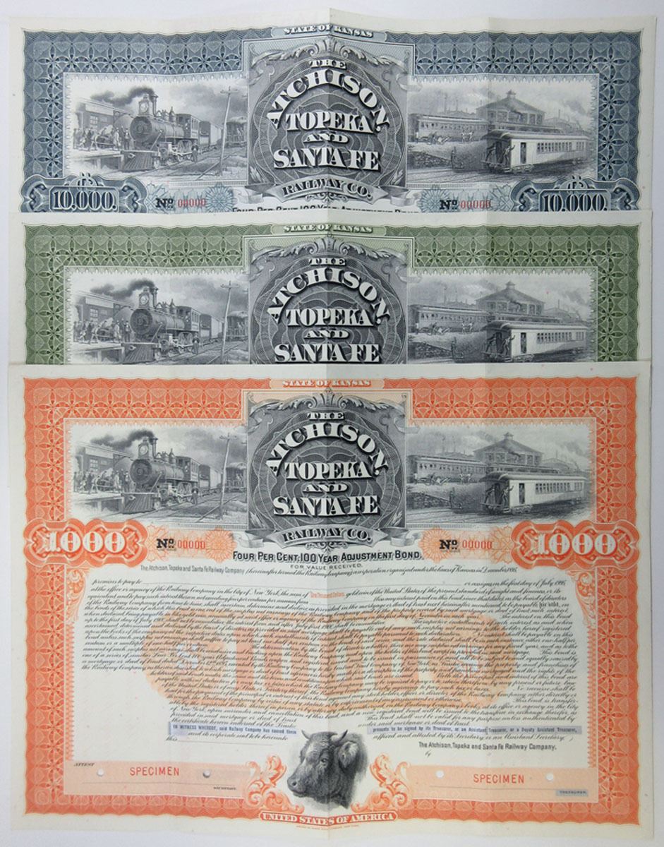 MO. KS. 1895, Lot of 3 Specimen Registered Bonds. 1) $1,000 Registered 4% Specimen One Hundred Year Adjustment Bond, Black print on orange border and under tint on horizontal format. 2) $5,000 Registered 4% Specimen One Hundred Year Adjustment Bond, Black print on green border and under tint on horizontal format. 3) $10,000 Registered 4% Specimen One Hundred Year Adjustment Bond, Black print on steel gray border and under tint on horizontal format. All have the same vignette of two locomotive scenes flanking company title at center and small image of a steer at bottom , Specimen overprints and POC's, and are VF-XF in condition. ABNC. 3 pieces.