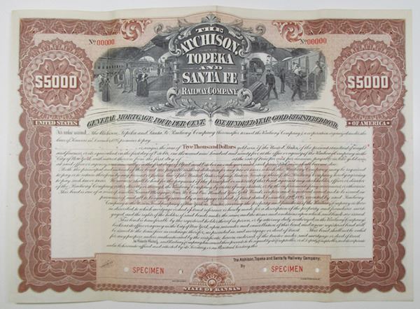 Kansas, 1895. $5,000 Specimen 4% Registered General Mortgage Gold Bond, Black text with brown border and underprint, Pair of train station scenes at top. Red specimen overprints, 00000 serial numbers, and POCs. VF condition, ABNC.