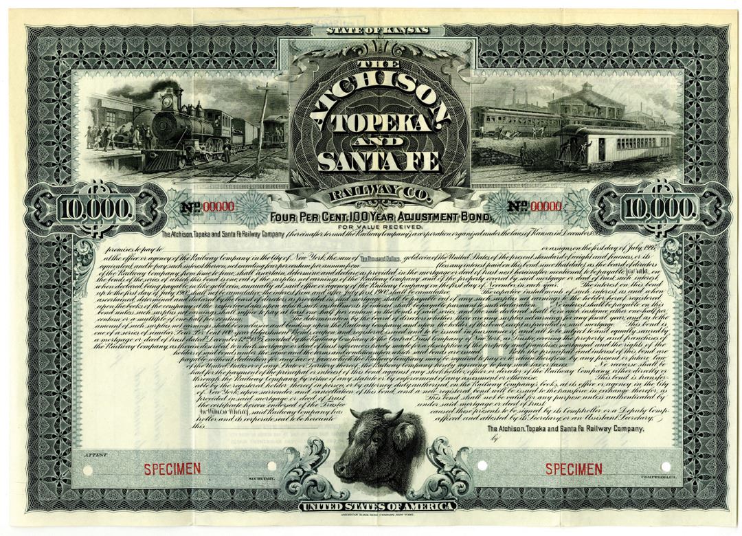 Kansas, ND (1880s). $10,000 Specimen 4% Registered Adjustment Bond, Black text with blue border and underprint, Train scenes at both top left and right, steer at bottom middle. Red specimen overprints, 00000 serial numbers, POCs. Fine-VF condition, ABNC. Rare as a specimen.