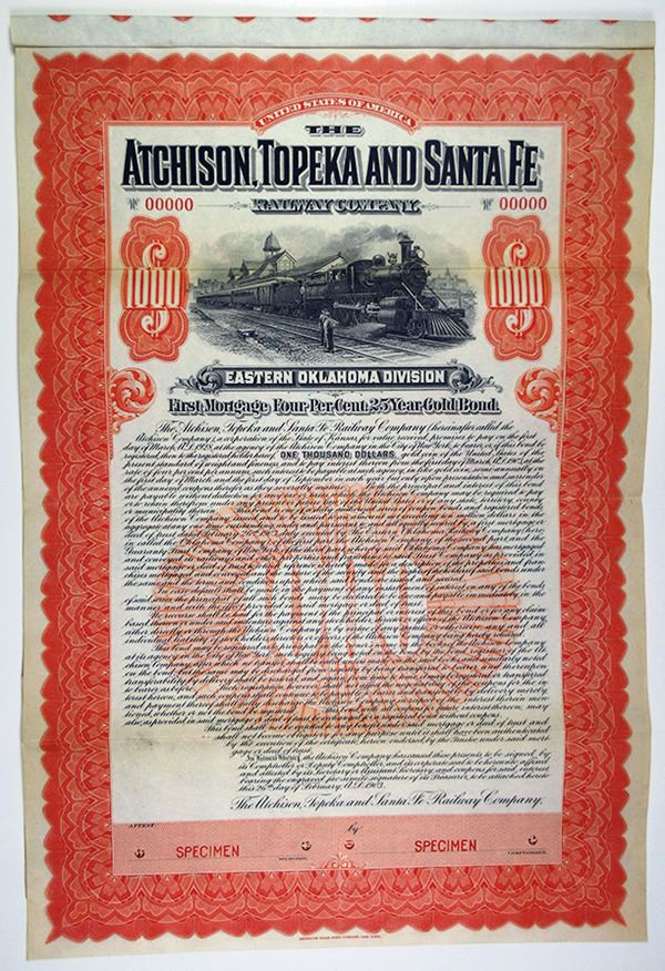 Kansas, 1903. $1000 First Mortgage 4% Gold Coupon Bond, Black text with red-orange border and undertint, Two rail workers standing next to moving locomotive at top. Red specimen overprints, "00000" serial numbers and POC's, condition is VF with some light smudging near bottom of bond, ABNC NY. Only known as a Specimen in Cox, no issued examples known.