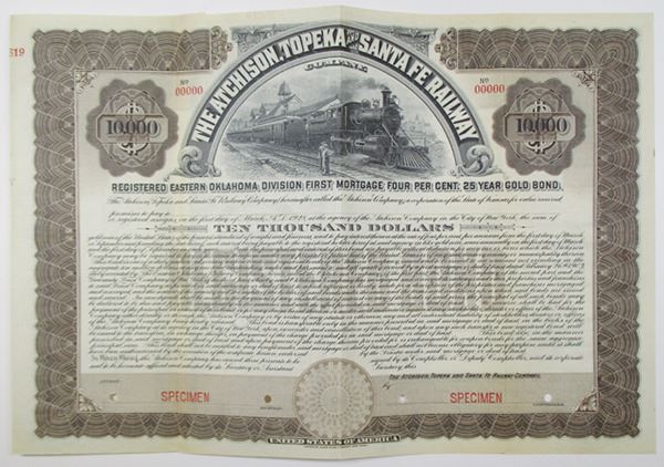 Kansas, 1908. $10,000 Specimen 4% Registered Eastern Oklahoma Division First Mortgage Gold Bond, Black text with brown border and underprint, Train passing by a pair of men at top center. Red specimen overprints, 00000 serial numbers, and POCs. VF condition, ABNC. Only known as a specimen in Cox.
