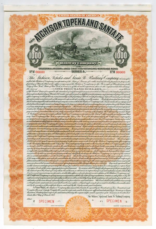 Arizona and California. 1912 $1000 Specimen, California-Arizona Lines, First and Refunding Mortgage Bond, Series A, orange, train, trackworkers, farmers, with coupons attached, Uncirculated, POC's, folded in thirds as made. ABNC. Listed railroad in Cox but unlisted as a Coupon bond, only as a registered bond.
