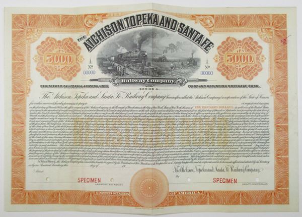 Kansas, 1912. $5000 Specimen 4.5% Registered California-Arizona Lines First and Refunding Mortgage Bond, Black text with orange border and underprint, Train passing by fields with men at work at top center. Red specimen overprints, 00000 serial numbers, and POCs. VF condition, ABNC. Only known as a specimen in Cox, no issued examples known, Rare.