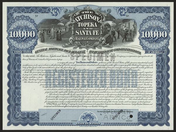 Kansas, 1895, $10000, 4% 100 Year General Mortgage Specimen Bond, Horizontal format, Black on blue border and underprint, SPECIMEN overprint, VF condition, ABNC.