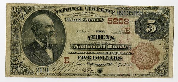 Athens, Pennsylvania. $5, Issued banknote, S/N 2101-H910586H, VG condition.