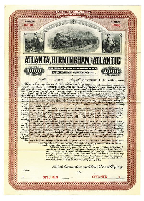 Atlanta, Birmingham and Atlantic Railroad Co., 1906 Specimen Bond