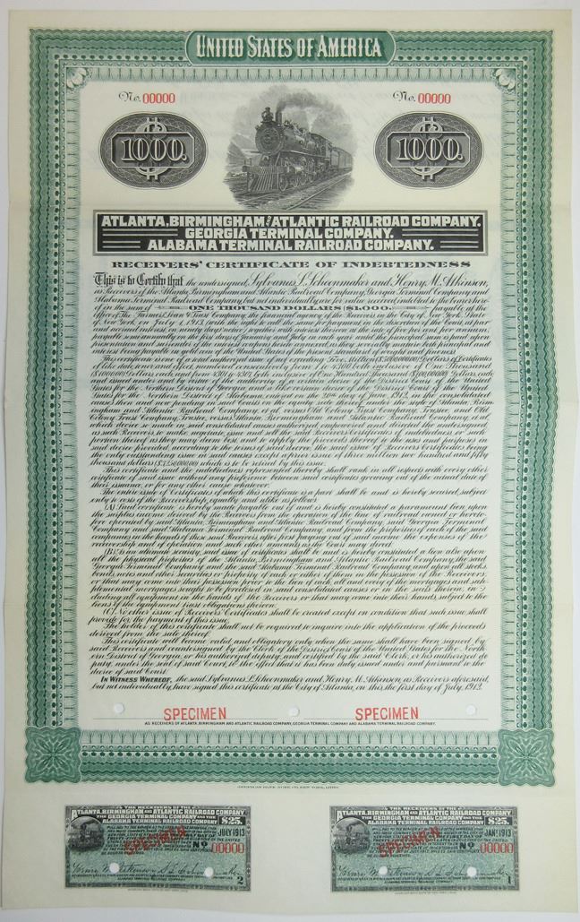Alabama & Georgia. $1,000 Specimen 5% Receivers' Certificate of Indebtedness Coupon Bond, Black print on green border and under tint, Locomotive at top above company title, Specimen overprints and POC's, VF-XF condition, ABNC. Listed railroad on Cox, unlisted Color.