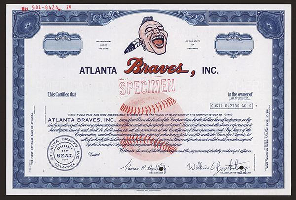 Atlanta, Georgia, (ca.1960's-70's). Odd Shares. Specimen stock certificate. Laughing Native American Indian on top of title with undertint of large baseball in middle in red. Red specimen overprint and POC's. Choice uncirculated condition. Rare and popular baseball certificate but not politically correct. ABNC.