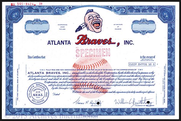 Atlanta, (ca.1960's-70's). Odd Shares. Specimen stock certificate. Laughing Native American Indian on top of title with undertint of large baseball in middle. Red specimen overprint and POC's. Choice uncirculated condition. Rare and popular baseball certificate. ABNC.