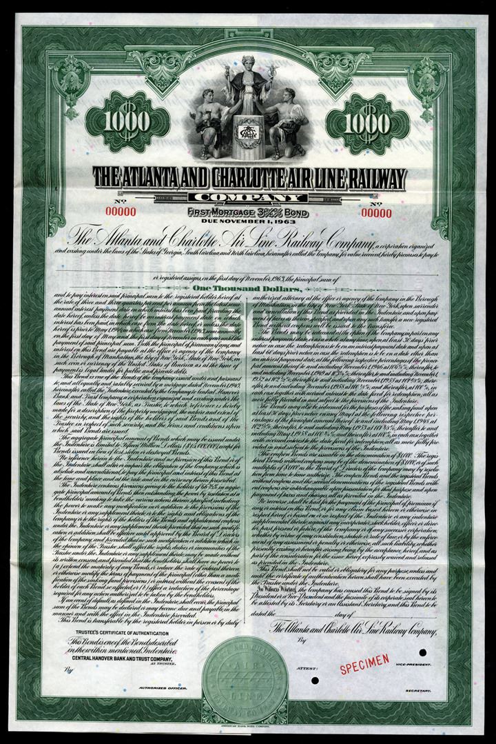 Georgia, South & North Carolina. $1,000 Specimen 3 3/4% Registered 1st Mortgage Bond, Black print on green border and under tint, Allegorical figures at top, Specimen overprints and POC's, VF-XF condition, ABNC.