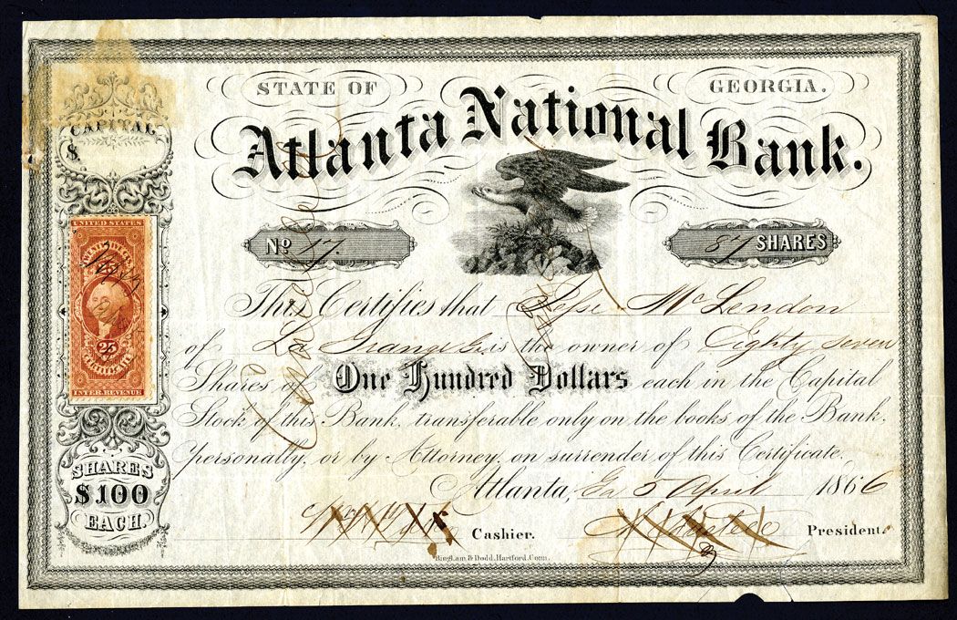 Atlanta, Georgia. 87 Shares, I/C, Eagle top middle, Revenue stamp on left, Ink cancelled and paper remnant on top left corner, S/N 17. Scarce Post War Reconstruction related bank stock. Fine.