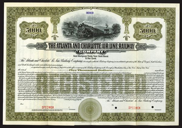 Georgia, South Carolina & North Carolina. $5000 Specimen 5% Series B 1st Mortgage Gold Registered Bond, Black print on olive green border and under tint in horizontal format, Approaching locomotives at top, Specimen overprints and POC's, VF-XF condition, ABNC.