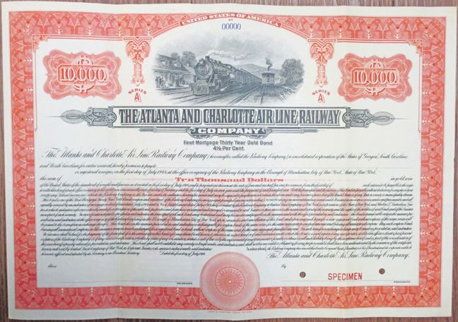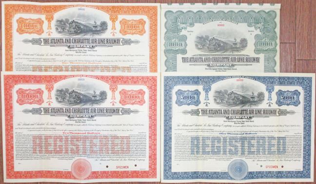 Georgia, South Carolina & North Carolina. 1914, Lot 4 pieces, Includes: $1000 Specimen 4.5% First Mortgage Gold Coupon Bond in green; $1000 Specimen 4.5% Registered First Mortgage Gold Bond in orange; $5000 Specimen 4.5% Registered First Mortgage Gold Bond in blue; and $10,000 Specimen 4.5% Registered First Mortgage Gold Bond in red-orange. All have specimen overprints, 00000 serial numbers, and POCs. VF condition, ABNC. The $1000 Orange and $5000 blue bonds are unlisted in Cox, only 3 examples of each found in the ABN Archives in 2002. (4)