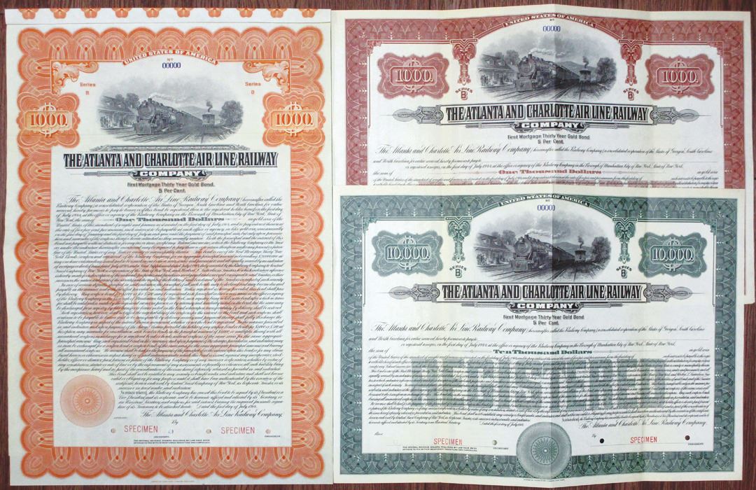 Georgia, South Carolina & North Carolina, 1914, Lot of 3 pieces, Includes: $1000 Specimen 5% First Mortgage Gold Coupon Bond in orange; $1000 Specimen 5% Registered First Mortgage Gold Bond in brown; and $10,000 Specimen 5% Registered First Mortgage Gold Bond in green. All have specimen overprints, 00000 serial numbers, and POCs. VF condition, ABNC. All are only known in specimen format in Cox and are rare. . (3)
