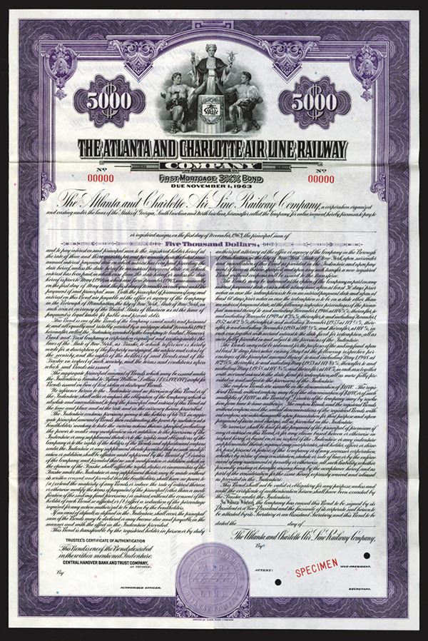 Georgia, South Carolina & North Carolina. $5000 Specimen 3 3/4% 1st Mortgage Registered Bond, Black print on purple border and under tint, Group of allegorical figures at top, Specimen overprints and POC's, VF-XF condition, ABNC.